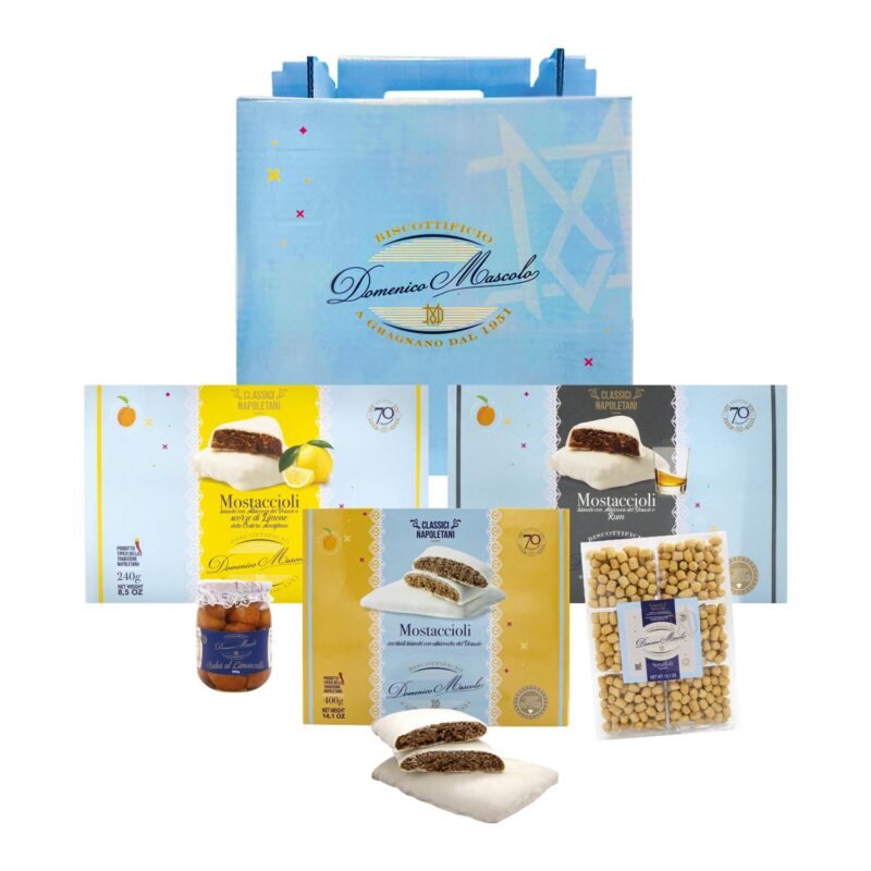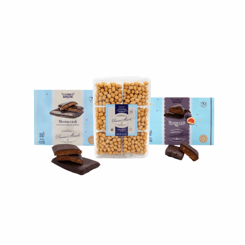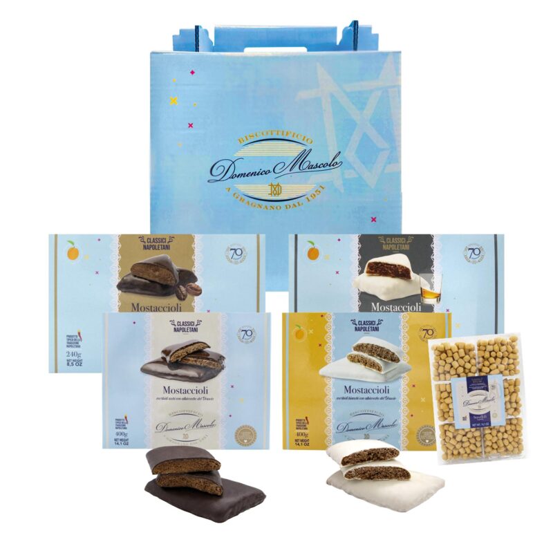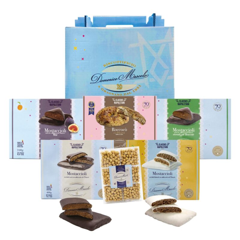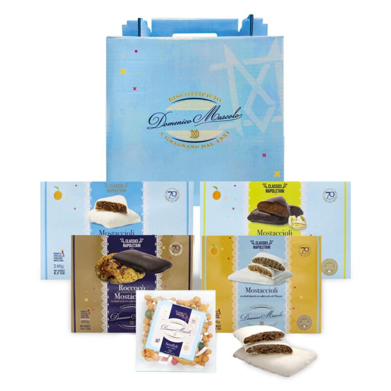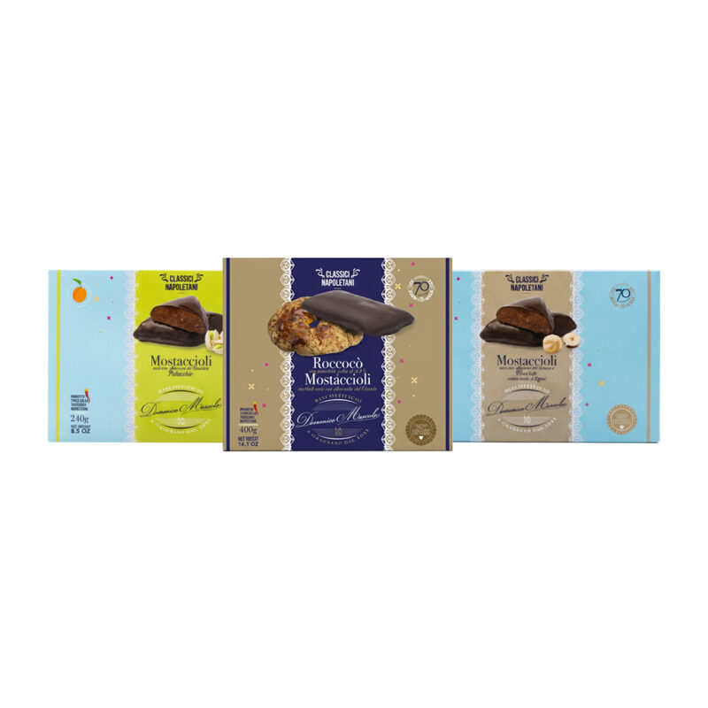 Un assortimento pensato per chi ama i sapori autentici della tradizione: un delizioso misto di roccocò e mostaccioli, accompagnato da un mostacciolo farcito al pistacchio e uno alla nocciola.